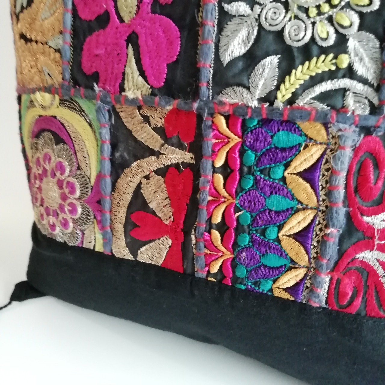 インドの古布をふんだんに使用した豪華なクッションカバー。オンリーワンの布の組み合わせが楽しい。