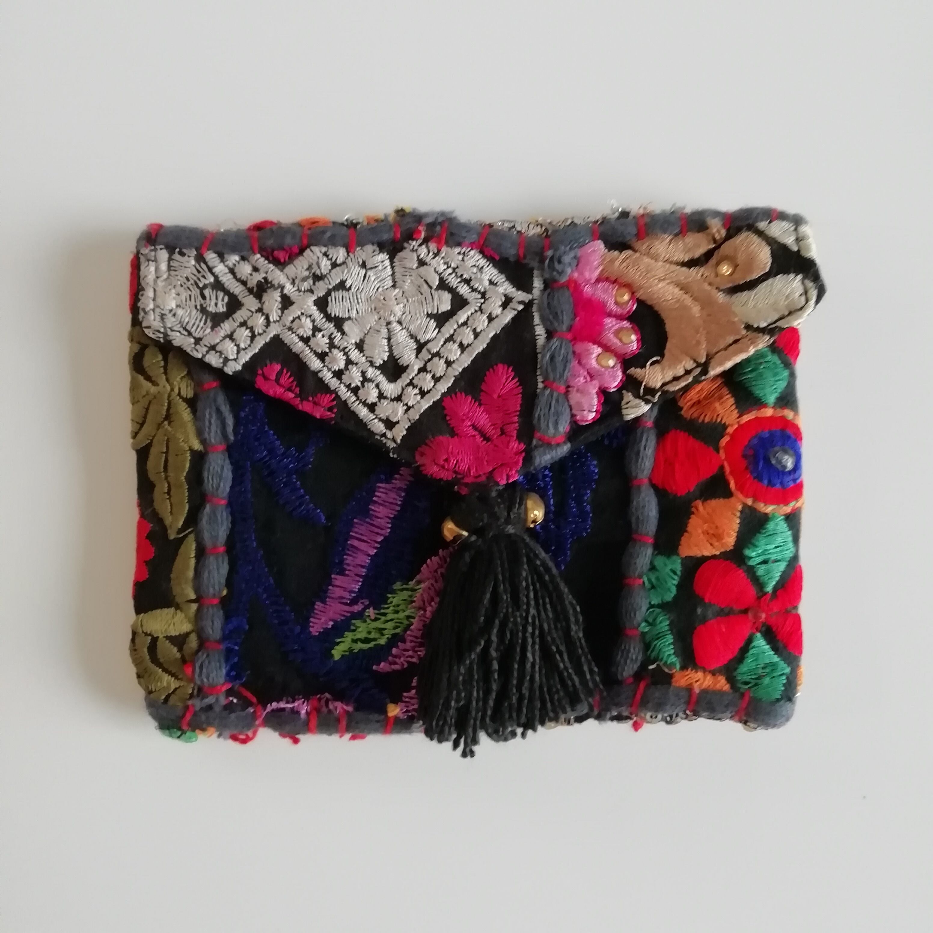 インドの古布にフリンジ、鈴など装飾が贅沢なシリーズ。オンリーワンの布の組み合わせが楽しい。